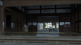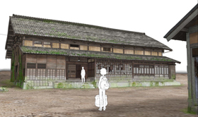 納屋スペースも特徴的な農村型の古民家。親子三人で暮らすには充分すぎる広さ。壁として固定された部分が少なく、襖(ふすま)を取り払うと空間が一面に広がる。開放的なつくりは室内だけでなく、縁側もガラス戸を外すと柱二本を残してすべて開口部になる。映像カルチャーマガジン・ピクトアップ#77(2012年8月号 6月18日発売)『おおかみこどもの雨と雪』の美術について、大野さんのインタビューを掲載