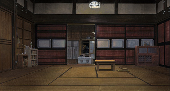 生活の中心的なスペースである、居間。美術ボード(上・右下)と劇中映像(左下)。色合いや光の感じをどう描くかに苦心したとのこと。たとえば夏のシーンなら、「夏の昼下がりの、日本家屋独特のひんやりとした暗い雰囲気」を出すため、畳への映り込み一つをとっても、光や色がどれぐらい反射するか試行錯誤が凝らされている。