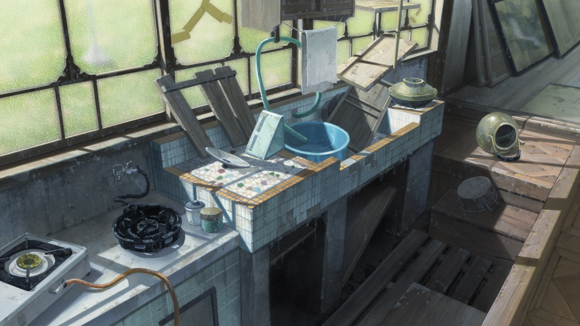 花が掃除をしているシーンで写る台所の流しのタイルは三回ぐらい描き直しました。古いけれどかわいらしい感じのものです。監督から「このシーンの台所のタイルだけは宝石みたいにキラキラした感じにしてほしい」と言われて、最初は汚れていたものを描き直し、ピカピカに磨き上げたものにしたんです。