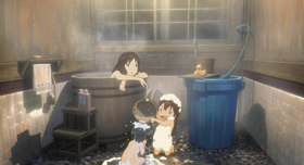 主人公の花たちが引っ越してきたときの台所の劇中映像(上)と美術ボード(左下)、お風呂場シーンの劇中映像(右下)。ロケハンした古民家にあったのは小さな台所だったが、設定段階で美術デザイン担当の上條さんが広い仕様に変更したそう。土間に敷いた簀の子(すのこ)に立って調理や洗い物、というスタイルは古民家ならでは。