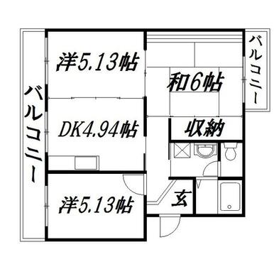 間取り | 3DK(DK4.94・洋室5.13・洋室5.13・和室6) | ||