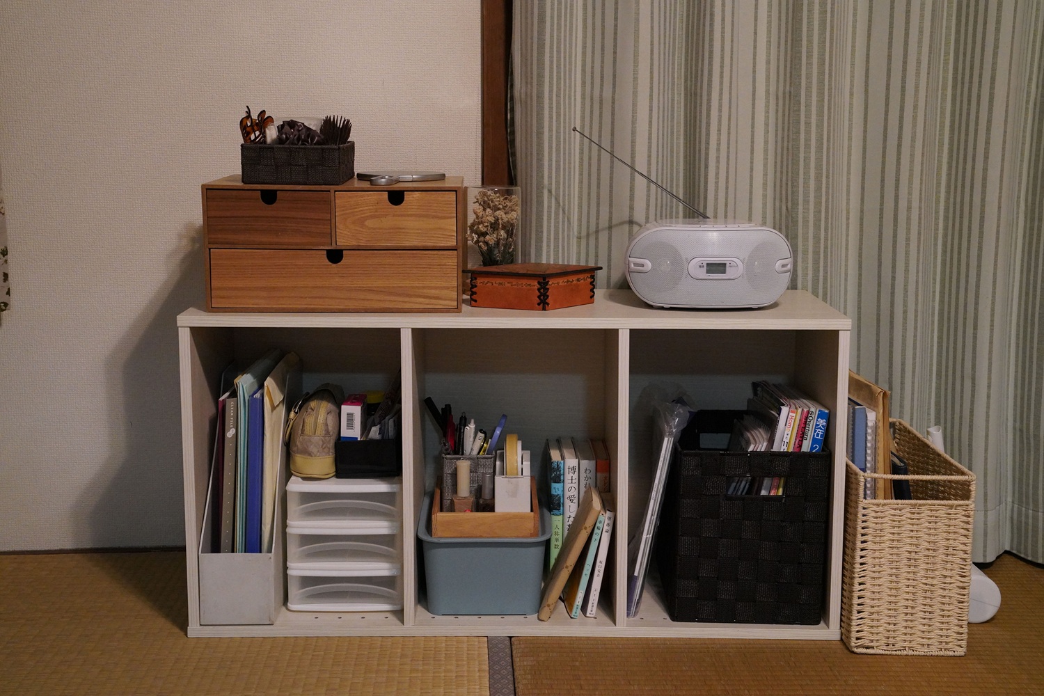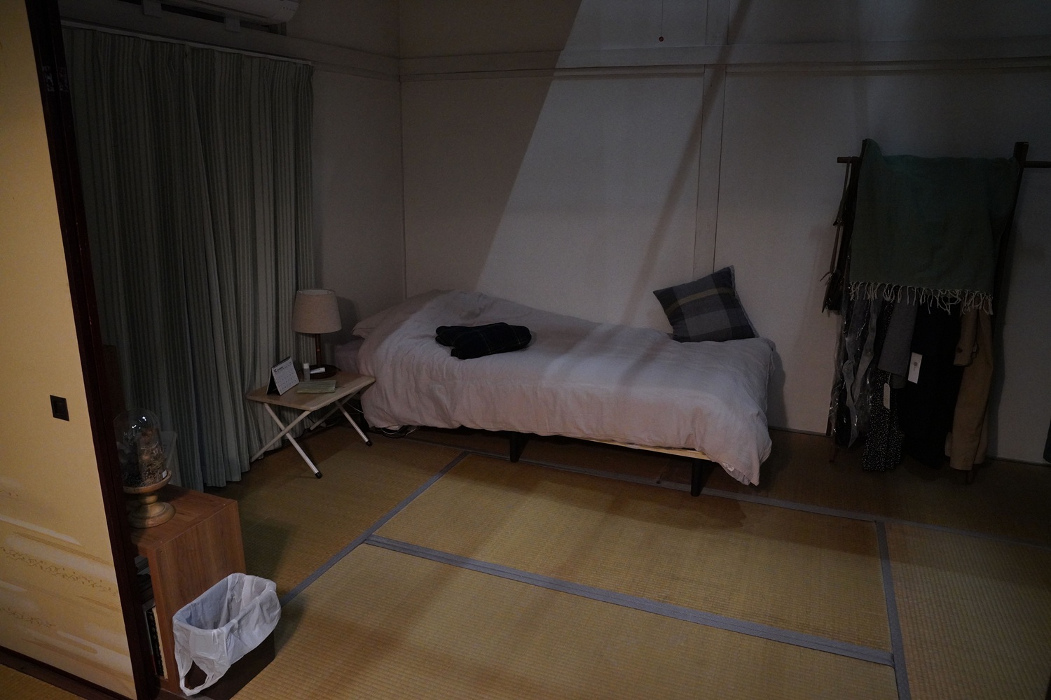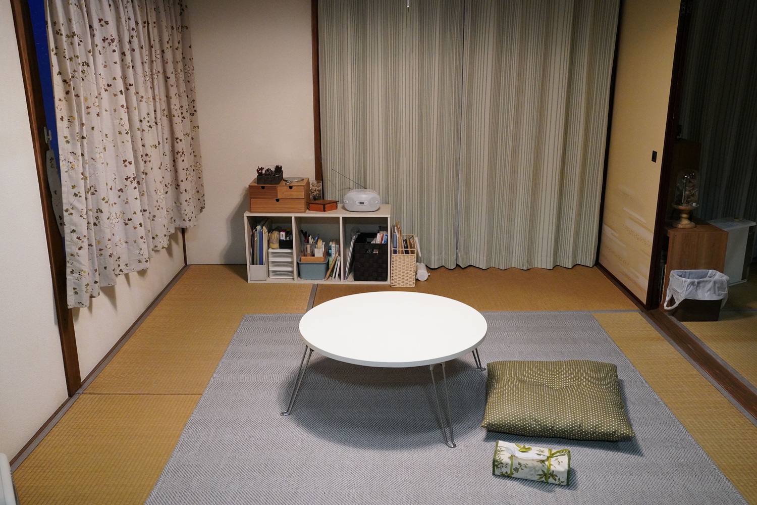 「一般的に、寒色を使うと寂しくなるし、暖色を使えばちょっと温かみのある部屋になる。今回は寒色を使いつつ、寂しくならないようにしたいと考えました。そのためにカーテンの緑の色合いなど、彩度に気を遣いました。たとえば畳のへりのオーソドックスな色見は、黒、紺、茶なのですが、スタジオで試しに並べてみると、へりのラインが目立っていると感じたので、主張がない色味にしました。どうでもいいじゃないかというこだわりが大事だったりするんです(笑)」