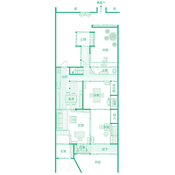 新湊ならではの、町家の特徴を生かした間取り。前庭に面した廊下には、経理などの仕事をする小さな作業場がある。玄関から台所へ抜けるスペースは、京都の町家のようなトオリニワにはなっておらず、土間を上がると板張りになっていて、台所へと続く。2階には航平の娘の部屋がある。