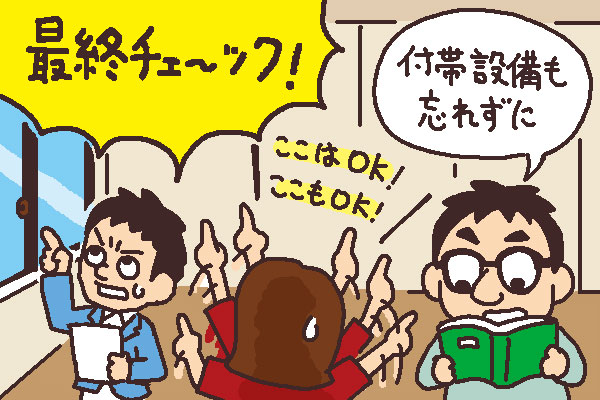特に中古物件の場合には、引き渡しまでにも状況が変わることがあるので、「付帯設備表」「物件状況等報告書」に照らして、しっかり確認しておきましょう。