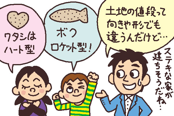 一般的に、正方形や長方形の土地に比べ、三角形や旗竿地など不整形な土地は価格が低めです。また、道路に面した間口が広いほど価格は高く、狭いほど低くなる傾向があります。