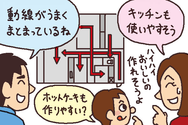 キッチンはスペースと設備をチェック。夫婦や子供たちと共同で料理することがあるなら、冷蔵庫や食器棚を置いた状況でも、シンク周りですれ違える広さがないと、使い勝手に影響します。設備面では、調理台の広さ、水栓の使いやすさ、収納などに注目しましょう。