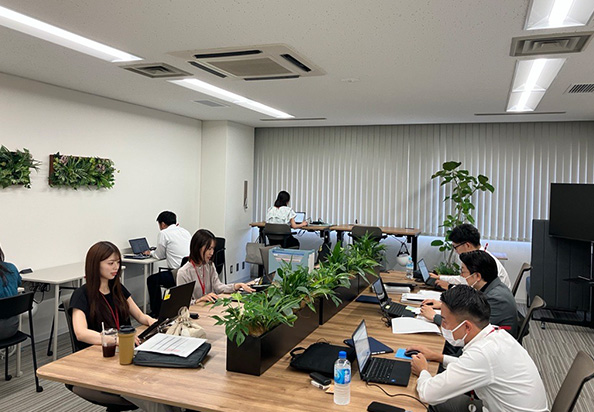 「蒲田」駅から近く、ビル内には営業部やさまざまな部署があります。2024年8月にフリーアドレスとなり、よりコミュニケーションが活発になりました。担当エリアは港区と渋谷区です。