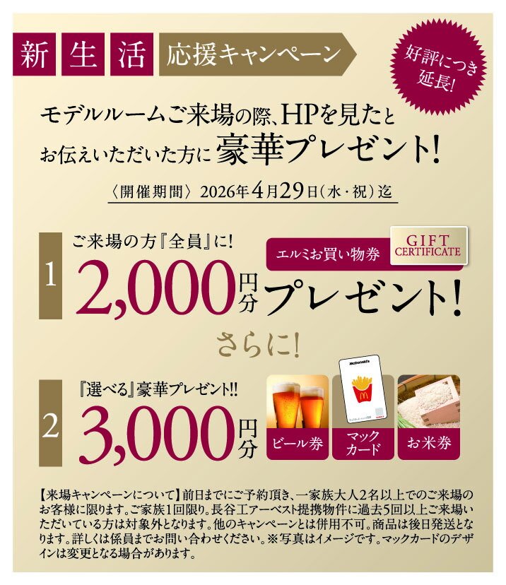 ※詳しくは現地係員にお問い合わせください。新生活応援キャンペーン<好評につき延長!> <モデルルームご来場の際、物件公式HPを見たとお伝えいただいた方に豪華プレゼント!>