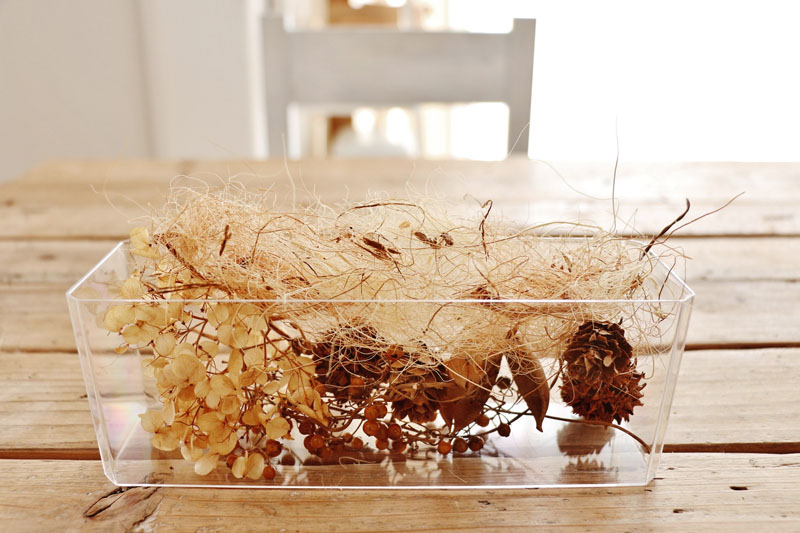 アンティーク加工のおかげで、アクリル素材とは思えないオシャレなディスプレイができました。ドライフラワーと一緒に、動物やキャラクターのミニチュアフィギュアを入れても賑やかで楽しそう!! みなさんも、お部屋に季節を彩るアイテムを取り入れてみませんか?
