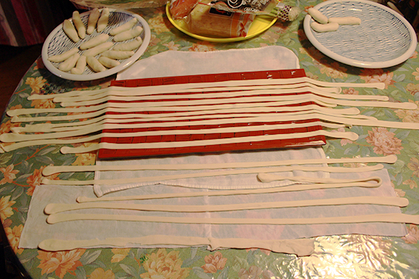 練り上がっただんごの塊を適当なサイズにちぎって1時間程度休ませると、程よくグルテンが形成されて長ーーーーーく伸ばすことができるんだそうです。